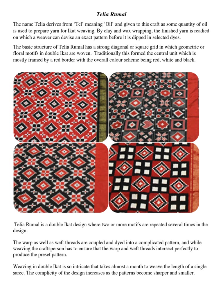 Telia rumal double ikkat pure silk sarees samprada pochampally handloom sari. 2 double ikat telia rumal cotton sarees. Some noted designers like gajams are popular for telia rumal designs. It originated from chirala in andhra pradesh. At chirala, in the prakasam district of andhra pradesh where the craft started. Traditionally red, black and white colours are woven in geometrical designs to make a telia rumal. Telia rumal is a method for the oil treatment of yarn. Telia rumal is a design for the oil treatment of oil. Out of a population of 100,000 there are 20,000 hand weavers, but only one family until recently involved in the telia rumal. Telia rumal can only be created with traditional handloom process. Telia rumal is a very intricate double ikat weave. Telia rumal neftni davolash usulidir ip. The telia rumal is largely a men's product.